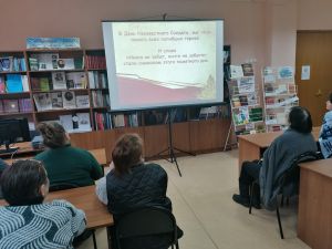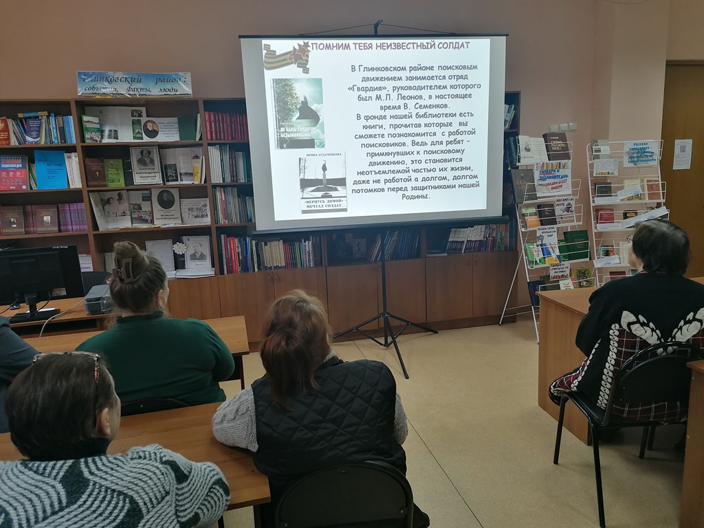 В преддверии Дня Неизвестного Солдата, в читальном зале  Глинковской библиотеки  был проведен   час истории «Его звание – солдат!». На мероприятии речь шла   об  истории  возникновения   памятной  даты – День Неизвестного Солдата, что этот день  –   память о российских и советских воинах, погибших в боевых действиях на территории нашей страны или за её пределами, чьё имя осталось неизвестным.