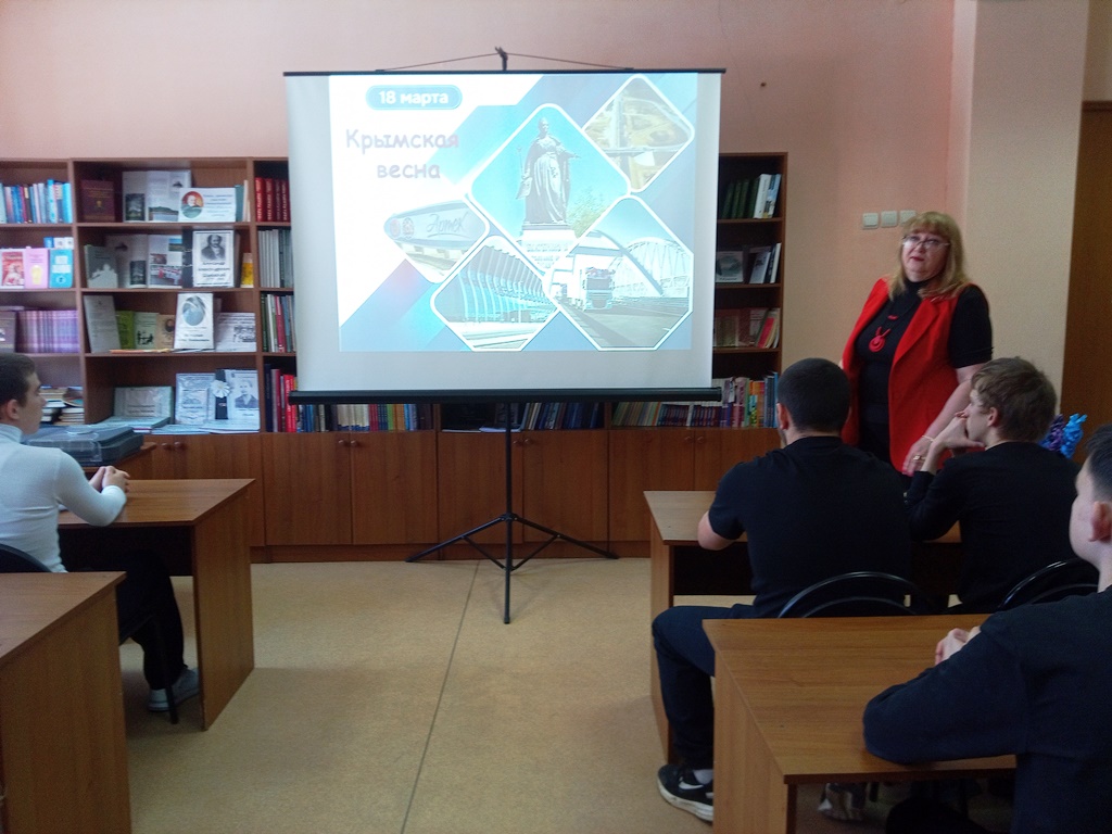 Воссоединение Крыма с Россией – это знаковое событие, которое открывает новую страницу в истории Крыма. В этом году исполняется 12 лет с той исторической даты, когда свершилось поворотное событие. В честь знаменательного для каждого россиянина праздника в   читальном зале Глинковской библиотеке был проведен патриотический час, который посетили учащиеся 9 класса Глинковской школы.