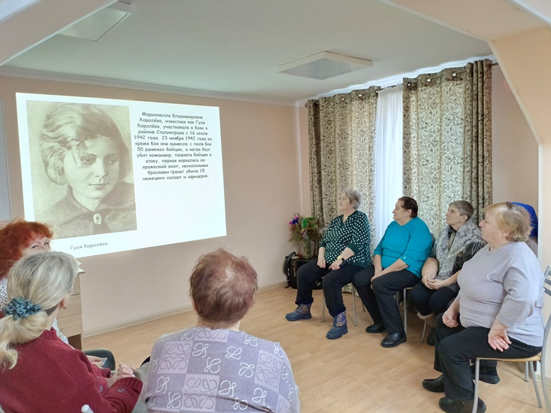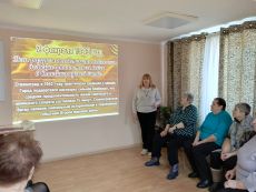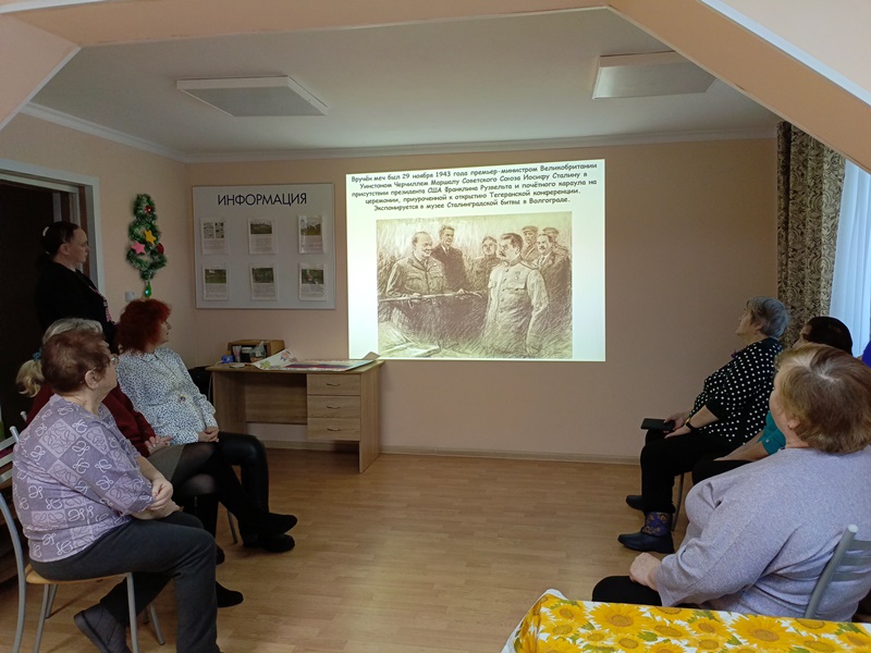 2 февраля в СОГБУ «Ельнинский КЦСОН» с. Глинка в «Клубе золотого возраста» заведующий отделом обслуживания МБУК «Глинковская Библиотека» М.В. Костюченкова провела устный журнал «Город русской славы – Сталинград», состоящий из четырех страниц: «Город, который выстоял», «Подвиг, который нельзя забыть», «Здесь решалась судьба мира», «Горячий снег Сталинграда».