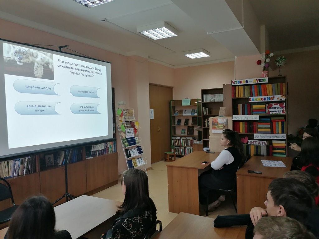 24 октября в читальном зале Глинковской библиотеки для учащихся 9 класса Глинковской школы состоялся экологический час «Властелин горных вершин». На мероприятии ребята узнали о том, что снежный барс или ирбис – один из самых таинственных хищников планеты, и заслуженно носит прозвище «призрак гор», он может быть совсем рядом, но вы никогда его не заметите. Именно такая скрытность затрудняет учет их численности и делает каждую встречу с этим животным по-настоящему уникальной. Будущее снежного барса остается под угрозой. Вид занесен в Красную книгу.